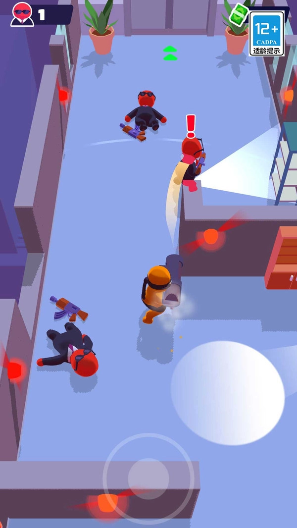 1、操控角色在建筑里潜行,点击屏幕移动,躲掩体,绕开敌人视野。