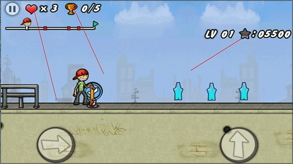 1.先把滑板小子安装好,然后打开游戏进入。游戏界面左边的方向键用于调节速度,右边的按键则能操控角色跳跃。