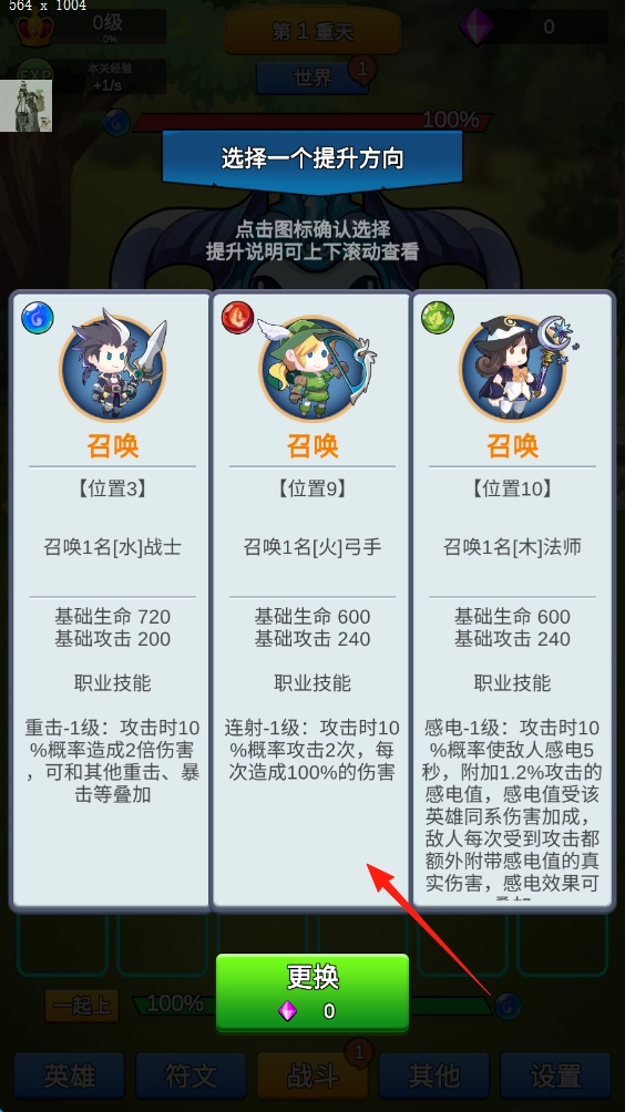 1、选择中间那个带[火]标识的弓手,点击更换按钮,召唤这名英雄加入你的阵容,这样能增强队伍的输出能力。