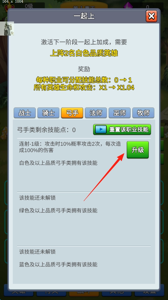 2、满足上阵条件后,点击升级,强化弓手连射技能,增加攻击频率伤害。