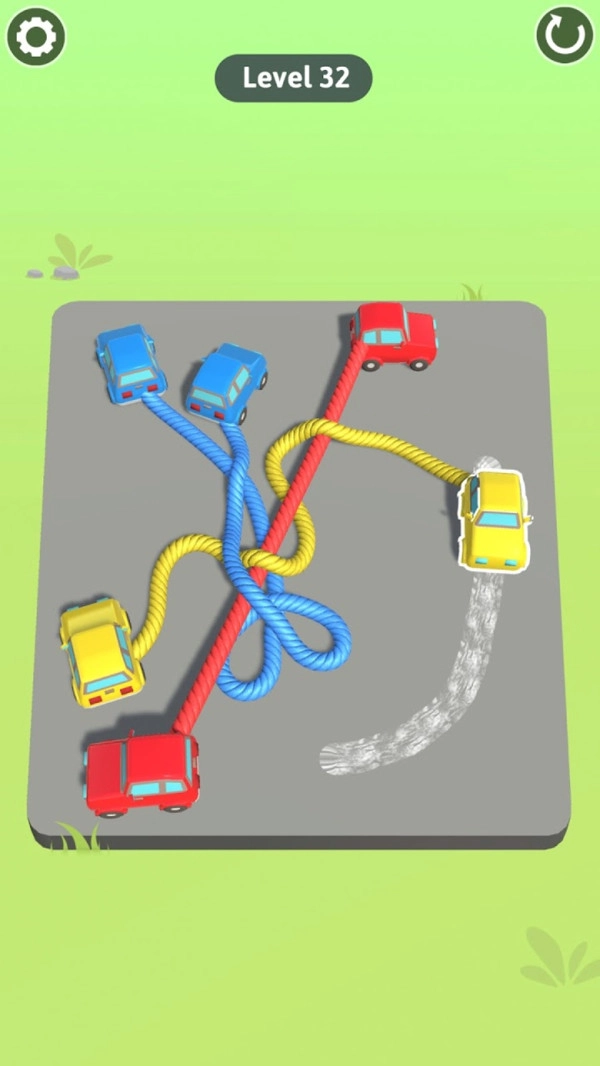 1、玩法介绍:绳索汽车解开是一款考验脑力的休闲游戏,玩家需要解开被绳子绑在一起的各色汽车。