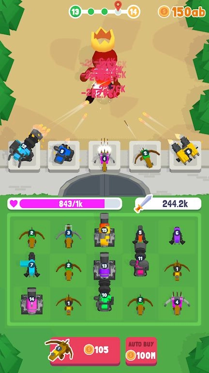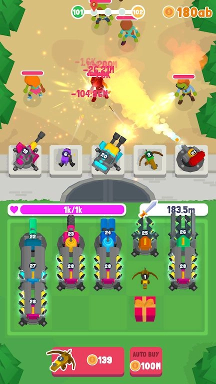 炮塔军队是一款竖屏放置类塔防游戏。凶悍的僵尸大军正朝着我们的城堡步步逼近,赶紧布置各类武器攻击僵尸、守护城堡吧!游戏融入了合并玩法,玩家能将同等级的炮塔合并以增强战力,击败僵尸可获得金币,用于购置新武器。不同武器在射速、威力等方面各有差异,玩家需巧妙搭配,才能构建起坚不可摧的防线哦!