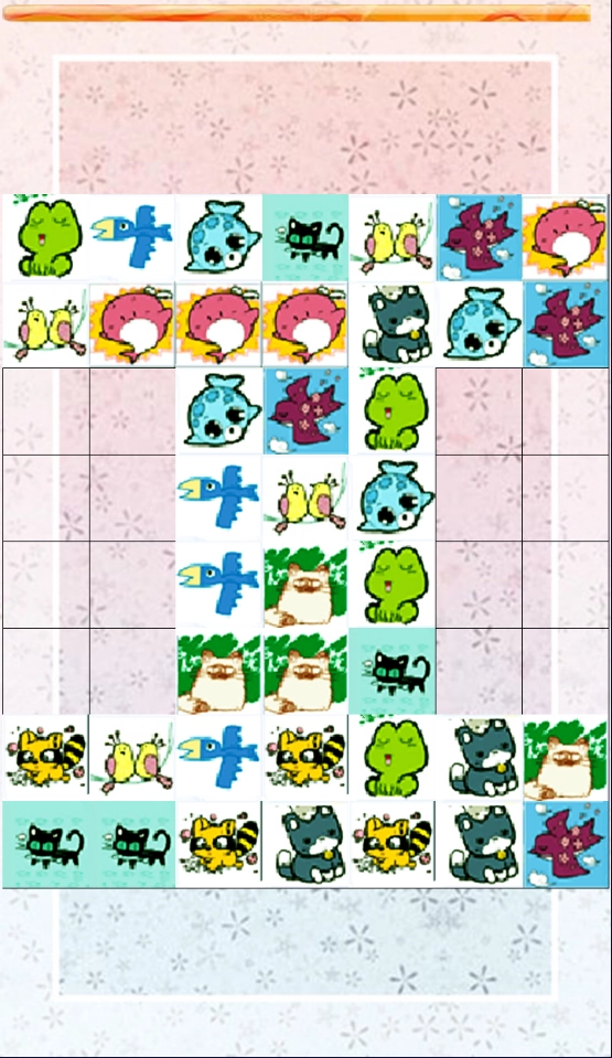 进入关卡之后,会看到很多不同的动物图像,发现两个相同的就可以点击消除,不能拐弯,只可以直线,随着关卡的难度增加,消除之后整个界面显示会发生移动,有的是往左,有的是往右,有的向上收缩,有的是向下收缩,变化比较多样