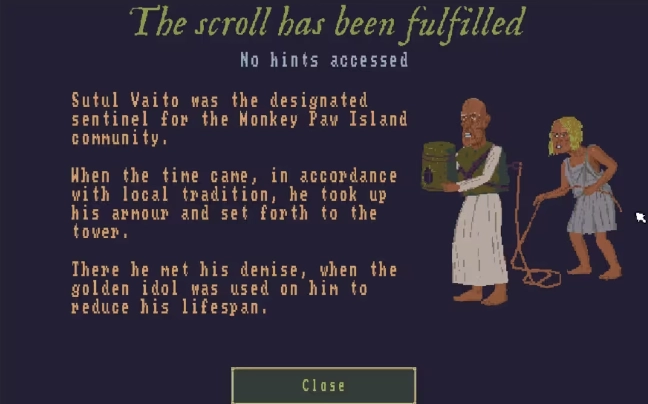 3、传说,猴爪岛上自古便有塔中魔(Tower Dweller),该恶魔会逃出塔外屠戮村民。只有守卫者带上贴着符咒的头盔,来到塔前大声念出咒语,才可将塔中魔赶回塔里,并封印一段时间。现任守护者Vaito并按照传统,念出咒语,金偶像减短了他为数不多的寿命。