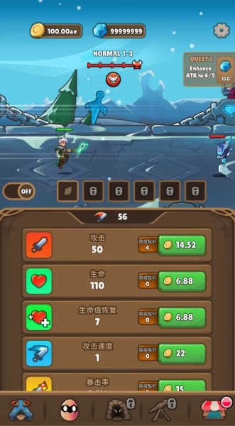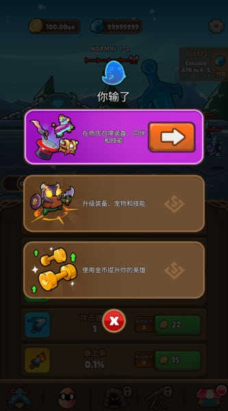 1、第一次进入游戏时,你会看到英雄已经自动开始战斗了。打败敌人后,就能获得金币、钻石这类资源奖励。要是输了,就得想办法提高自身属性来让战斗力变得更强。
