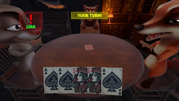 《骗子酒馆2025》正版安装包对应的是一款类似俄罗斯轮盘赌的桌面游戏。游戏将背景设定在氛围沉郁的酒馆之中,玩家会和狐狸、河马、猎犬这三位动物伙伴,共同参与一场充满刺激感的欺骗纸牌对局。要想赢得最终胜利,你得运用撒谎、欺诈这类策略性技巧。玩法上,玩家们需要依次出牌,并报出牌面的数值。你可以选择虚报这个数值,但一旦被揭穿,就必须进行一轮俄罗斯轮盘赌。在六发子弹里躲过致命一击,你就能继续留在游戏中;要是失败了,那就意味着游戏结束。感兴趣的朋友,不妨现在就来挑战一下!