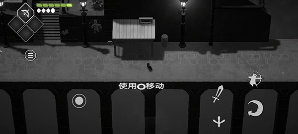 2、左下角按钮可以移动,上方是背包,右下角分别是攻击、射箭、交互和翻滚;