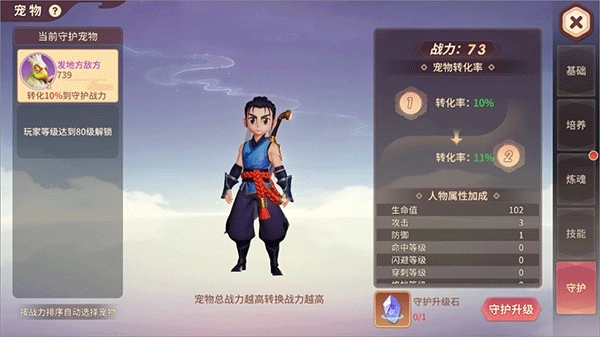 6、最后,作为大侠忠实的伙伴,宠物可以对侠士进行属性反哺。通过使用守护石,提升宠物对主人的守护等级,即可将宠物战力更多的转化到主人身上。
