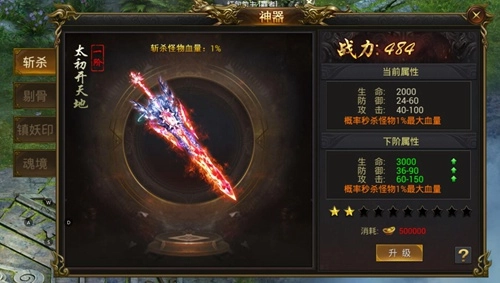 在神器系统中,有一神器名曰“斩杀”。提高斩杀的等阶,除了提供基础的生命、防御、攻击属性外,还能拥有概率秒杀怪物一定百分比血量的超绝属性。随着等级提升,秒杀不是梦