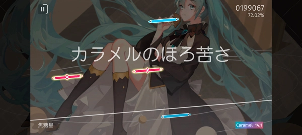 5、选好后进入游戏,玩法和《Phigros》相似,玩家需在配合音乐,在音符到达判定线时对其进行点按,长按和滑动等操作;