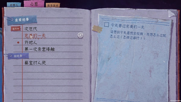 如果暂时没有计划好去做什么,游戏中也有类似任务系统的【心愿单】系统对玩家进行引导,在【主要的事】和【别的事】的列表中可以看到游戏大概的事情线,选择相应的心愿即可查看对应的进度,多多查看下【心愿单】来查看进度,或许你就能有新的发现。