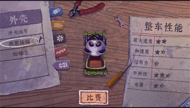 四驱车比赛:装备属性全高于对手即可获胜,赛后购买新配件并倒滑滑梯一次获得马达奖励(正面滑得随机食物)。
