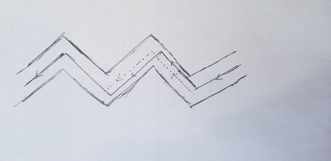 如果我们想要让音画重新同步,就要在下一个非正常转弯的前一个弯开始行动,图中我们在错位后,理论上会出现音乐延后的现象,那么在这个弯,我们就刻意晚一点点,然后再重新对齐,这样,相对虚线对应的正常路径,我们多走了一小段路径,从而与之前的偏差抵消。