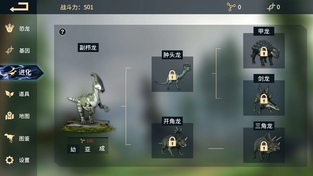 当进化值到达一定额度时,可以将自己的恐龙进行升级,一共分为二次进化和终极进化。