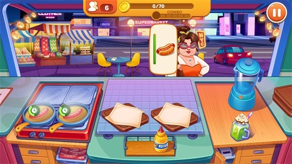 1、放松身心,沉浸在耳目一新的玩法里:通过烹饪美食、服务顾客来攻克关卡!