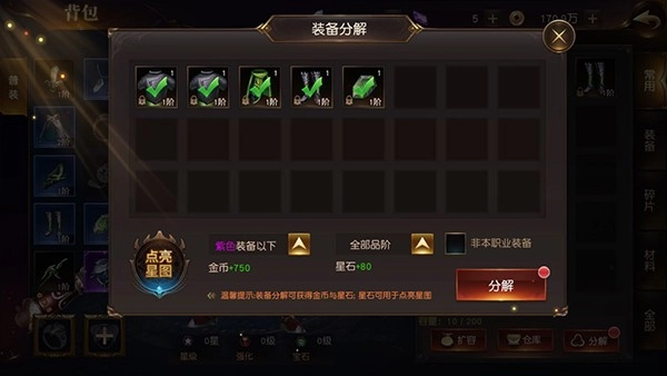 4、玩家通过主线任务获取的过多低级装备,可以在背包内进行分解,获取大量星石,金币。