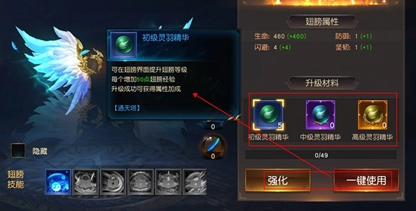 2、玩家还可以使用升级材料给翅膀升级强化,提高翅膀属性等级,增加属性加成。