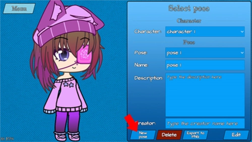 2、同样无默认Pose文件,点击点击下方的New pose创建我们的第一个pose,之后在上方的Character下拉框中选择我们的角色卡,然后点击右下角的Edit按钮来编辑我们的Pose