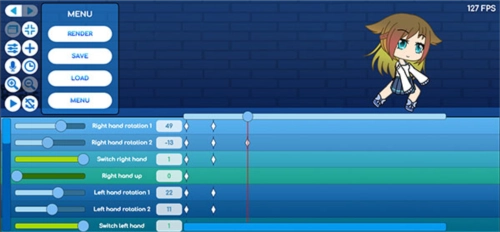 3、上方操作完成之后即可进入动画编辑界面,因为该方面功能较多,就不过多介绍,大致说下功能区块,左下方为角色动作区域,通过文字左侧的滑钮即可调整上方角色的动作,与姿势编辑类似,而右侧则是时间轴,例如我们调整了右手移动,同时在右侧时间轴中创建一个新的区域的话,那么右手就会在该时间内移动