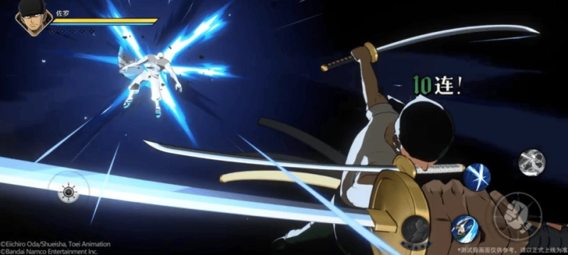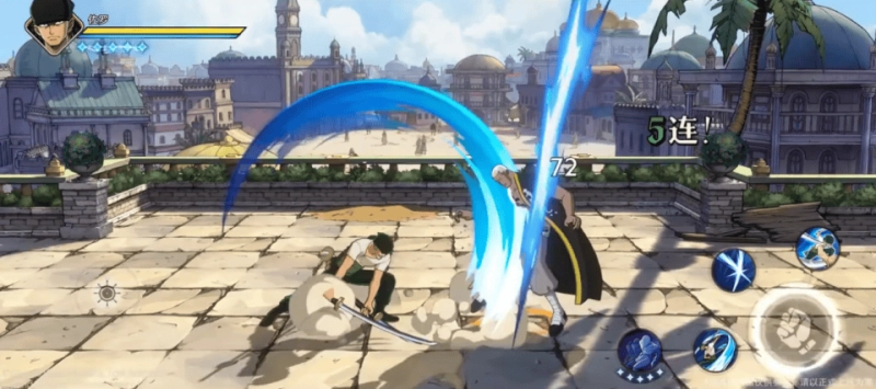 然后我们再逐个分析一下奈美和佐罗的技能效果。先来说佐罗吧,这个角色是跟鹰眼米霍克一样的华丽战斗风格,五个奥义点和精力值设定,释放技能会消耗精力值,技能没有冷却时间,精力值不足就无法释放技能。对于不同战斗风格不了解的可以翻看我之前的文章或者视频,这里就不多做赘述了。佐罗的普攻有四段,第三段有一个空中旋转下劈的效果,这一段可以通过摇杆控制方向。
