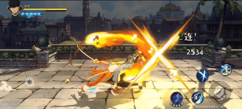 佐罗还有一个被动效果,两个技能后摇阶段都可以点普攻追加后两段的效果,二技能两段后摇也都可以追加普攻,如果追加的普攻命中对方会恢复一定的精力值。奥义就是比较经典的三刀流三千世界,终结技是一个快速位移攻击。(终结技相当于是一个达到一定条件直接终结对方的额外效果,所以设计上也比较简单)