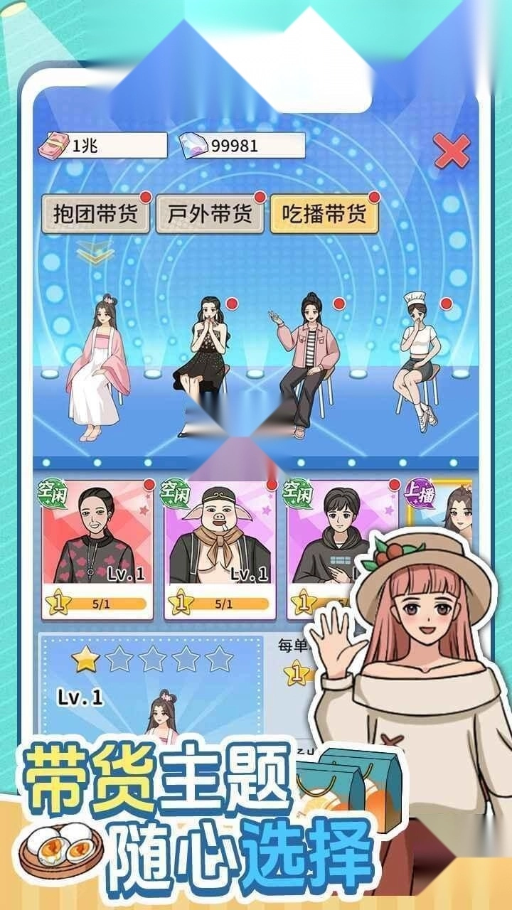 《带货王来了》是一款相当出色的模拟经营类游戏。在游戏里,玩家将以直播公司老板的身份,开启直播带货的业务。你得招募形形色色的主播来协助带货,通过升级培养主播的各项技能、改造直播间的场景布置,提升带货的效率,最终打造出专属于自己的商业帝国。
