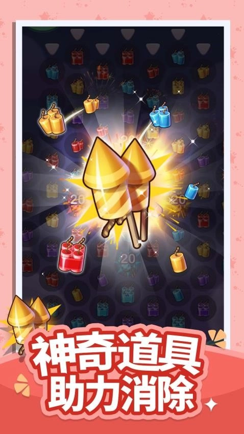 3、要是碰到消除难题也别担心,随时用各类增益道具助力你完成高分挑战。如此有趣的玩法,赶紧喊上你的小伙伴们一起来感受这迷人的掌上烟花吧!