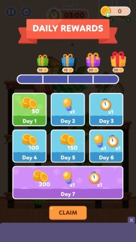 1、玩家启动游戏后,点击界面底部的“claim”按钮,就能免费获取当日签到对应的金币奖励。
