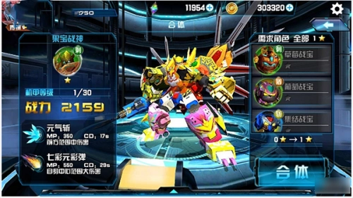 合体所需机甲:草莓战宝、葡萄战宝、集结战宝、蜜桃战宝、小果战宝、香橙战宝、菠萝战宝。