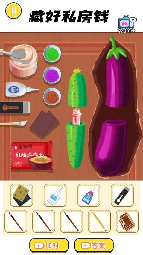 2、先用黄瓜吞掉现金,再让茄子包裹黄瓜,用胶水画笔修补茄子的破绽,最后把秘密藏在吱呀作响的木板下。