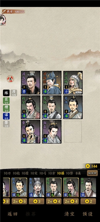 阵容解析:偏向控制的阵容。三马食槽强大的回复能力以及司马懿的威吓,郭嘉遗计的退场都为谋士们的输出提供了不少安全保证。司马懿作为签到送的橙卡,也为收集的难度减少了许多,最后一个空置的位置也可以根据自己单卡安上张辽补足输出和控制,也可以补上前排更好的吃伤害创造输出空间。