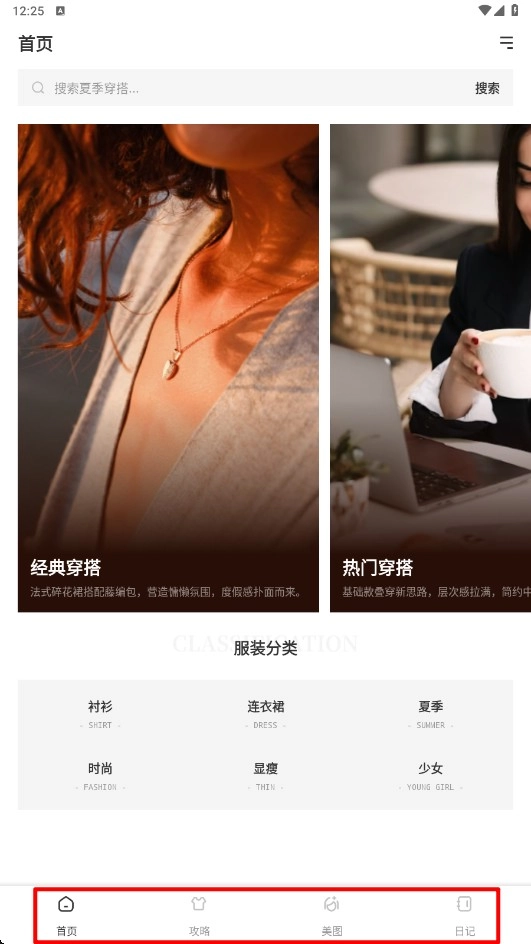 2、如图首页可选择经典穿搭或热门穿搭,也可根据服装分类选择穿搭。下栏可选择自己想要使用的板块,可以查看攻略,制作美图,还能写穿搭日记。