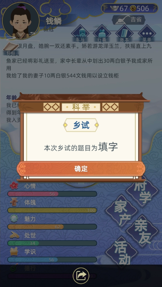 【16岁】解锁媒人,介绍知己可以看脸不过要倒贴钱100两起,等考上状元就能选大学士总督的女儿啦,魅力学识会稍微高一点。