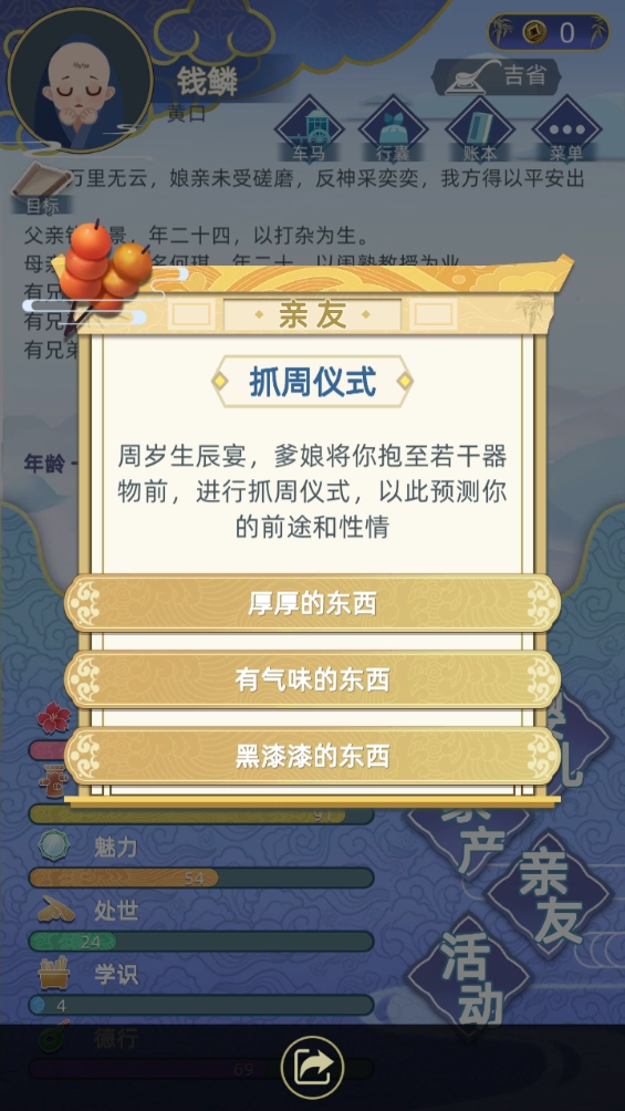 【3岁】可以找父母要钱。启动资金!请安,请安隔年加德行。解锁寺庙,刷文殊菩萨加学识,前期主加学识,参拜没有文殊老狗的选项点我就看看然后再点参拜,一直刷出文殊才参拜。