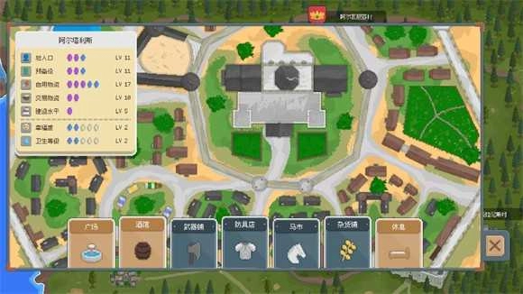 4、到达城镇后,可以在广场招募士兵,在酒馆获取情报,在武器铺购买或出售武器,在防具店交易装备,在马市买马,在杂货铺买卖食物等物资,还可以通过休闲功能恢复部队状态。