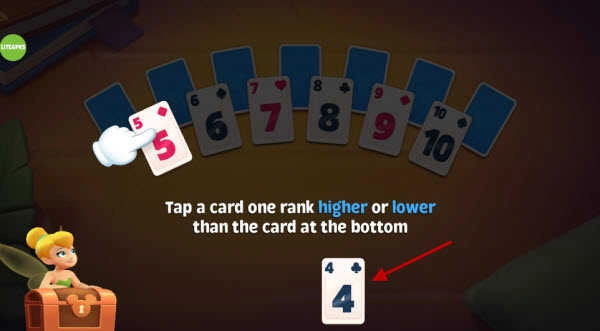 2、初始时,你会拥有一张位于屏幕底部的起始牌。例如当前是数字4,则需选择相邻数值的牌,即5或3。