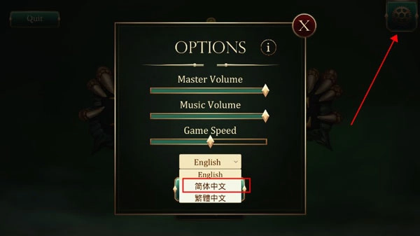 2、进入游戏,打开右上角的齿轮设置,在如下图所示中将语言调节为“简体中文”即可。