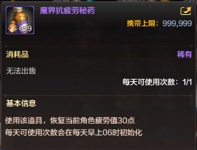 抗疲劳秘药可以恢复30点的疲劳值且每天只能使用一次。