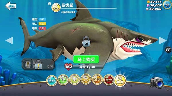 饥饿鲨世界有超过30种鲨鱼种类从7种不同大小的鲨鱼中选择,每个级别、每个环境里都有大量的敌人等着去消灭。