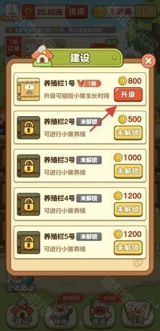3、玩家能够在游戏的【建设】界面,升级养殖栏(如养殖栏1号),解锁新栏位,提升养猪场的养猪效率
