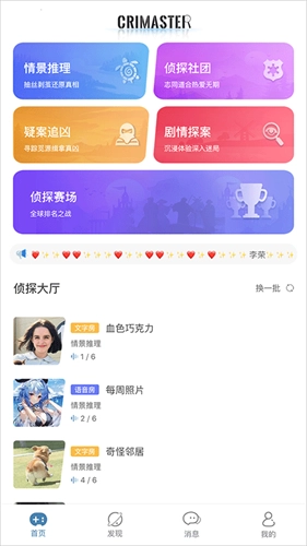 1、Crimaster犯罪大师首届面中有情景推理、无罪辩护、疑案追凶、剧情探案、侦探赛场几种玩法,玩家可以根据自己的喜好进行选择,例如:情景推理