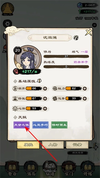 1、在角色界面中,查看基础属性与天赋的加成效果,了解当前角色的核心特质,养成系统针对性强化根骨、悟性等属性。