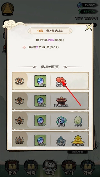 2、进入参悟大道界面后,查看升级所需条件与奖励预览,优先完成对应任务解锁奖励,这些资源可用于角色属性提升解锁。