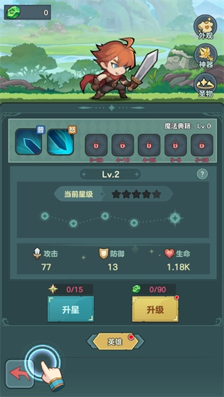 消耗资源对英雄进行升星和升级,提升攻击、防御、生命属性,解锁魔法典籍技能。