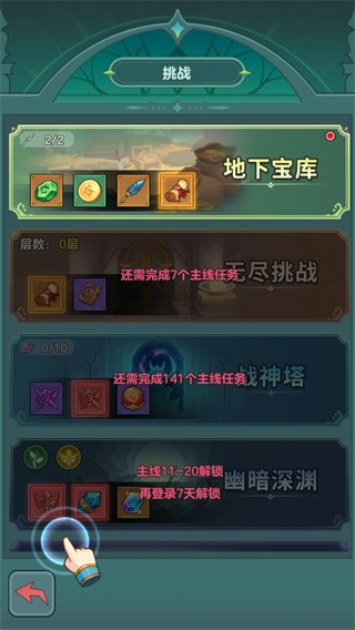 完成主线任务解锁“地下宝库”“无尽挑战”等挑战玩法,获取丰厚资源。