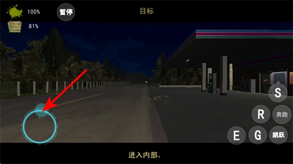 2、进入室外场景后,通过左侧的移动控件操控角色移动,朝着目标区域如建筑前进,同时留意界面的目标提示如进入内部,明确方向。