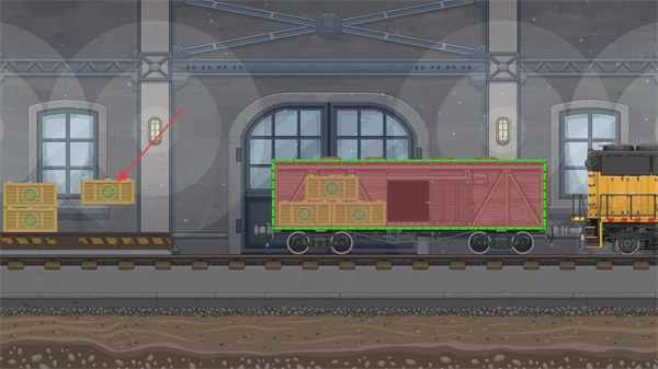 1、这是列车运输任务的装车准备环节,场景设定在火车站台,需要把红色箭头所指的带有标识的木箱搬运到绿色框选的红色车厢中,完成货物装载的前期操作,为接下来的列车运输工作做好准备。