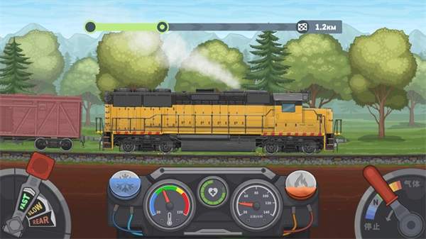 3、这是列车驾驶阶段界面,需通过红色箭头指向的气体操控杆调整列车动力,同时结合底部仪表监控状态,保障列车正常行驶。