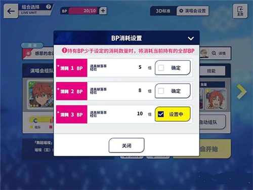 3、打歌的时候可以使用BP翻倍,多使用一些BP来完成一次歌曲,获得奖励会翻倍,这样结束的时候再使用翻倍卡又可以翻倍,打一首歌可以刷到很多奖励,最后充值应援月卡可以无限次使用翻倍卡。