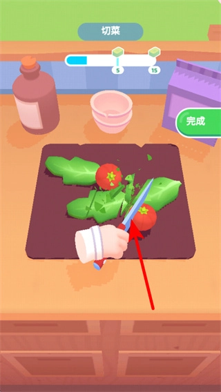 2、进入切菜环节后,通过操作刀具切割已准备好的食材如番茄、生菜,确保食材被均匀处理,完成切菜步骤后点击完成,推进制作流程。